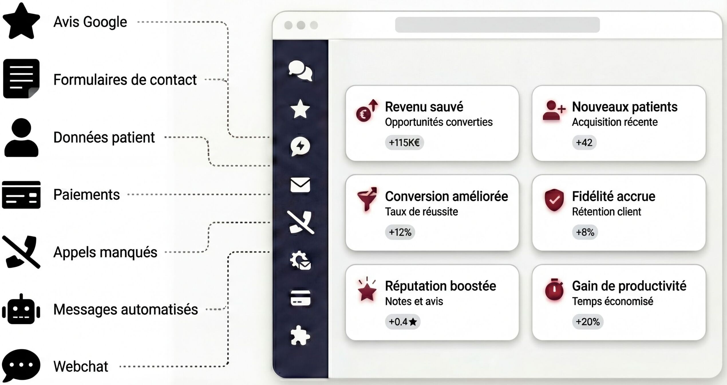 Il démarre immédiatement une conversation par SMS avec le patient, assurant la continuité de la discussion même s’il quitte le site. Fini les chats sans coordonnées. Résultat : plus de nouveaux patients.