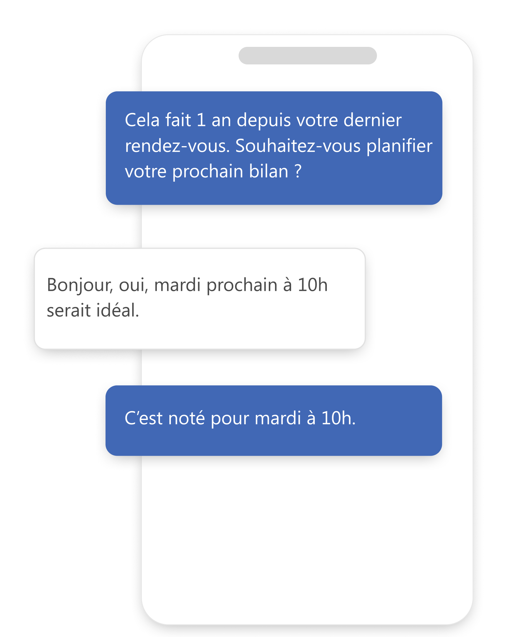 Automatisez facilement vos rappels de rendez-vous, l’envoi d’instructions préparatoires essentielles avant un examen, et toutes les relances nécessaires, directement par SMS.