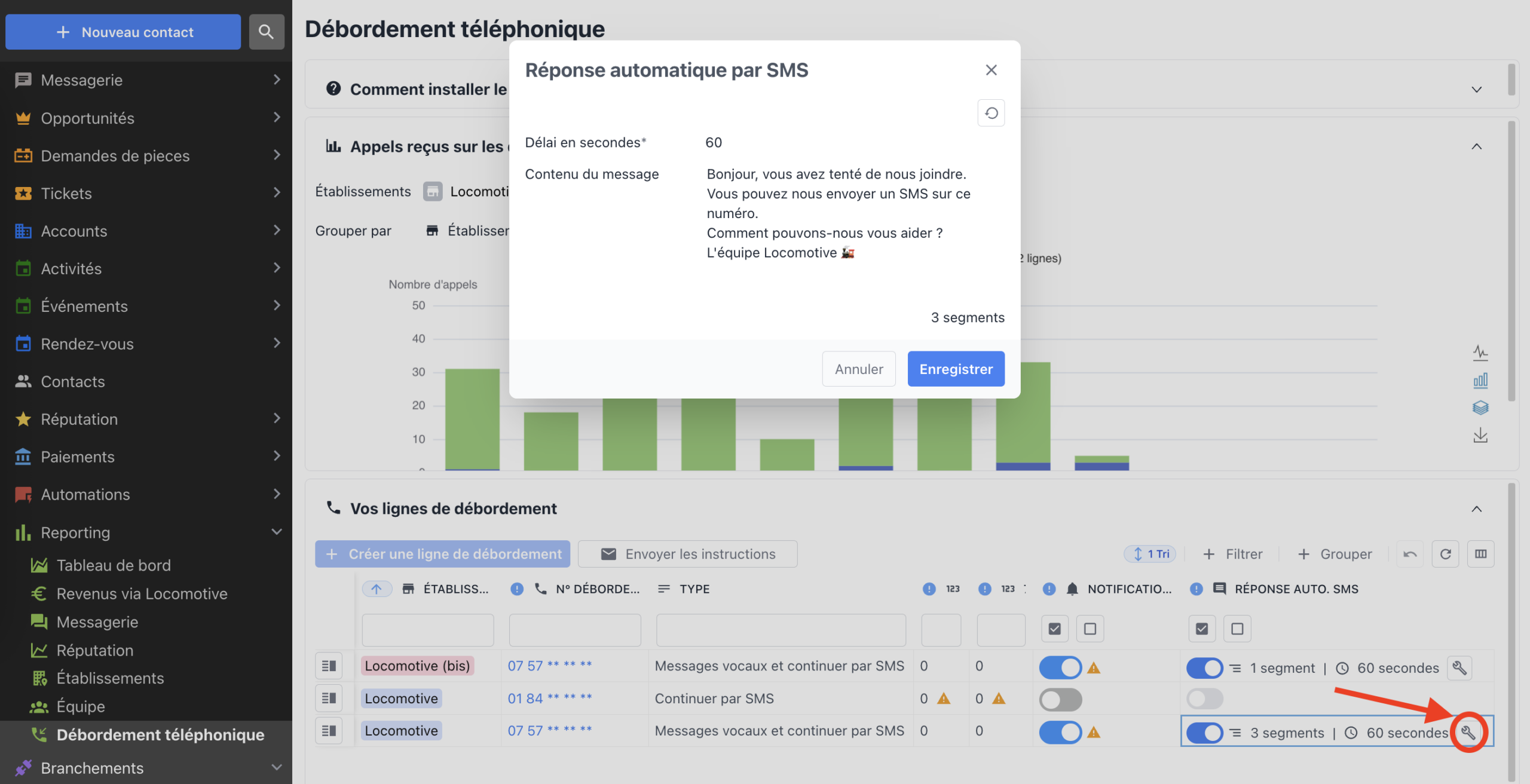 – Configuration personnalisée : Rendez-vous dans l’onglet Reporting > Débordement téléphonique pour activer la réponse et modifier le délai d’envoi paramétrable en secondes.