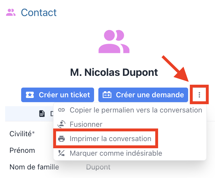 – Comment faire : Rendez-vous dans les détails d’un contact et cliquez sur les 3 points verticaux pour lancer l’impression.