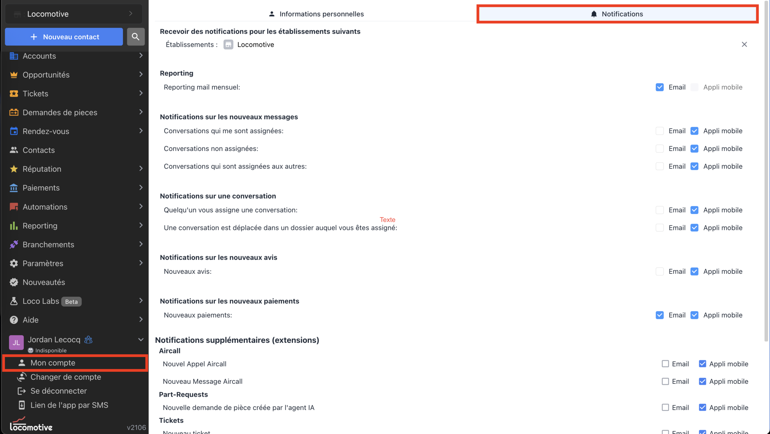 – Gestion des notifications : En tant qu’administrateur, vous pouvez désormais modifier directement les paramètres de notification de vos collaborateurs (la configuration a été déplacée dans le menu « Mon compte », rendant l’interface plus claire).